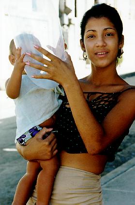 Mother (with inflated condom) and child